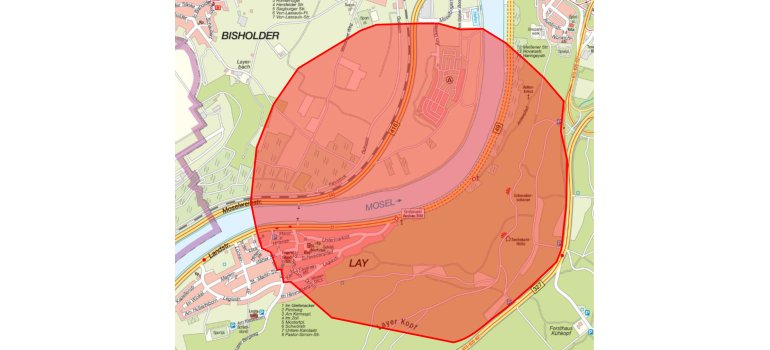 Betroffen ist hier ein Bereich des Stadtteils Lay, die dortige Kindertagesstätte sowie der Campingplatz Güls, der Sportboothafen, die Bahnstrecke entlang der Mosel und die Bundesstraßen 416 und 49. Die Bundesstraße 327 (Hunsrückhöhenstraße) wird befahrbar bleiben.