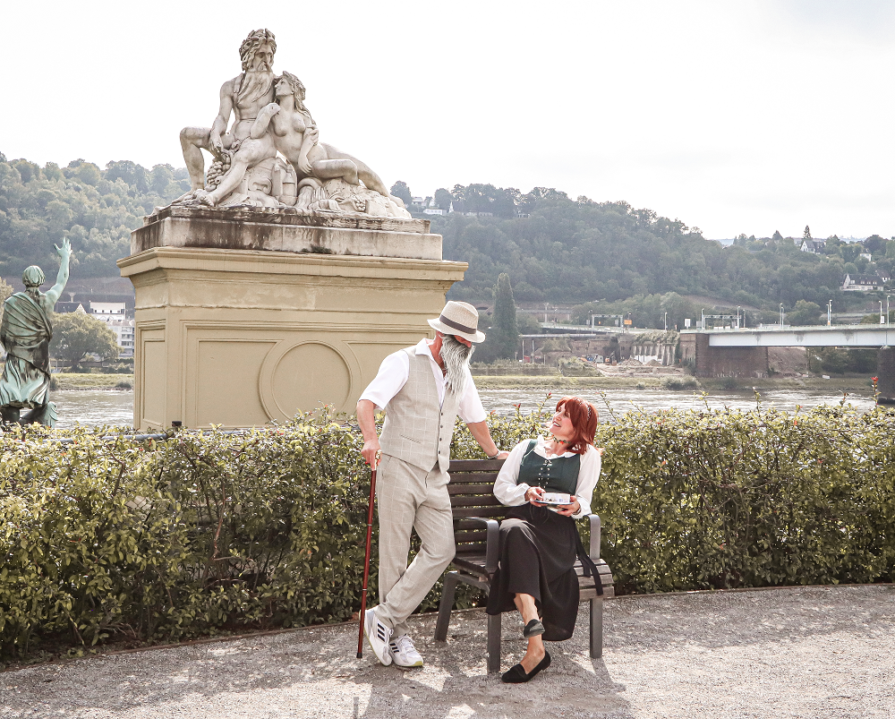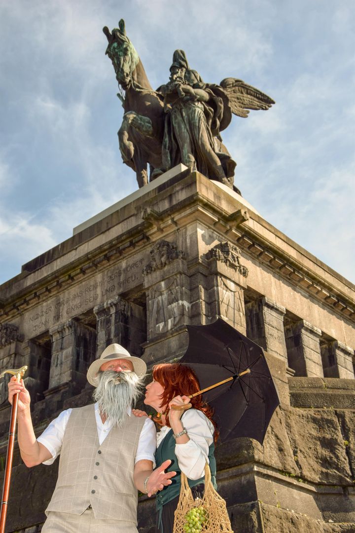 Diese außergewöhnliche Kostümführung beginnt genau an dem besonderen Ort, wo der Rhein die Mosel in seine Arme nimmt. Bei diesem außergewöhnlichen Spaziergang geben zwei erfahrende Gästeführer den Flüssen ein Gesicht. Gegensätze ziehen sich an – oder etwa doch nicht?! Was passiert, wenn die liebliche Madame Mosella auf den raubeinigen Rhenus trifft? Beim gemeinsamen Flanieren mit dem ungleichen Pärchen am Moselufer und entlang der Rheinpromenade gibt es so einiges kurioses zu entdecken. Geht es gar romantisch zu? Was geschieht, wenn die liebliche Mosella richtig sauer wird? Und was hat ein Lausbub mit Glück zu tun? Die unterhaltsame und leicht zu gehende Tour startet am Zusammenfluss am Deutschen Eck, unter der Deutschlandflagge am Kaiser-Wilhelm-Denkmal und endet nach ca. 1,5 Stunden (1,5 km) im Koblenzer Schlossgarten – natürlich mit einem Happy End. Freuen Sie sich auf eine amüsante Tour: unterhaltsam, geschichtlich und humorvoll.