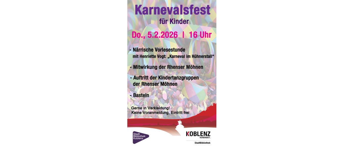 Do, 5.02.2026, 16 Uhr Kinderkarneval in der Zentralbibliothek mit den Rhenser Möhnen