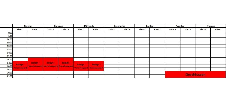 - Montags bis freitags analog zu den Trainingszeiten auf dem Kunstrasenplatz von 8:00 Uhr bis maximal 21:00 Uhr geöffnet.