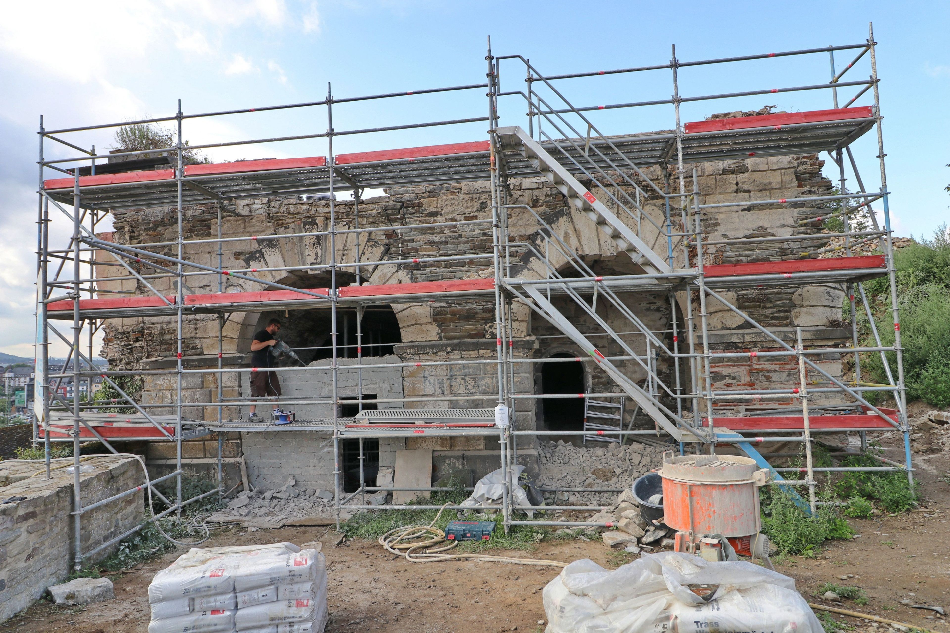 Noch bleibt der Durchgang für Besucher gesperrt. Aktuell laufen Arbeiten an der Gewölbedecke. Stahlanker wurden eingebracht, um die hangseitige Wand zu stabilisieren und die Bewegung des Bauwerks in Richtung der Bahnlinie zu stoppen und ein Verputz in historischer Technik schützt das Bauwerk dauerhaft. Auch an der äußeren Hangmauer wird gearbeitet. Risse im Mauerwerk werden verfüllt, marode Bereiche erneuert und die ganze Wand überschlämmt, um die Wand dauerhaft zu sichern.