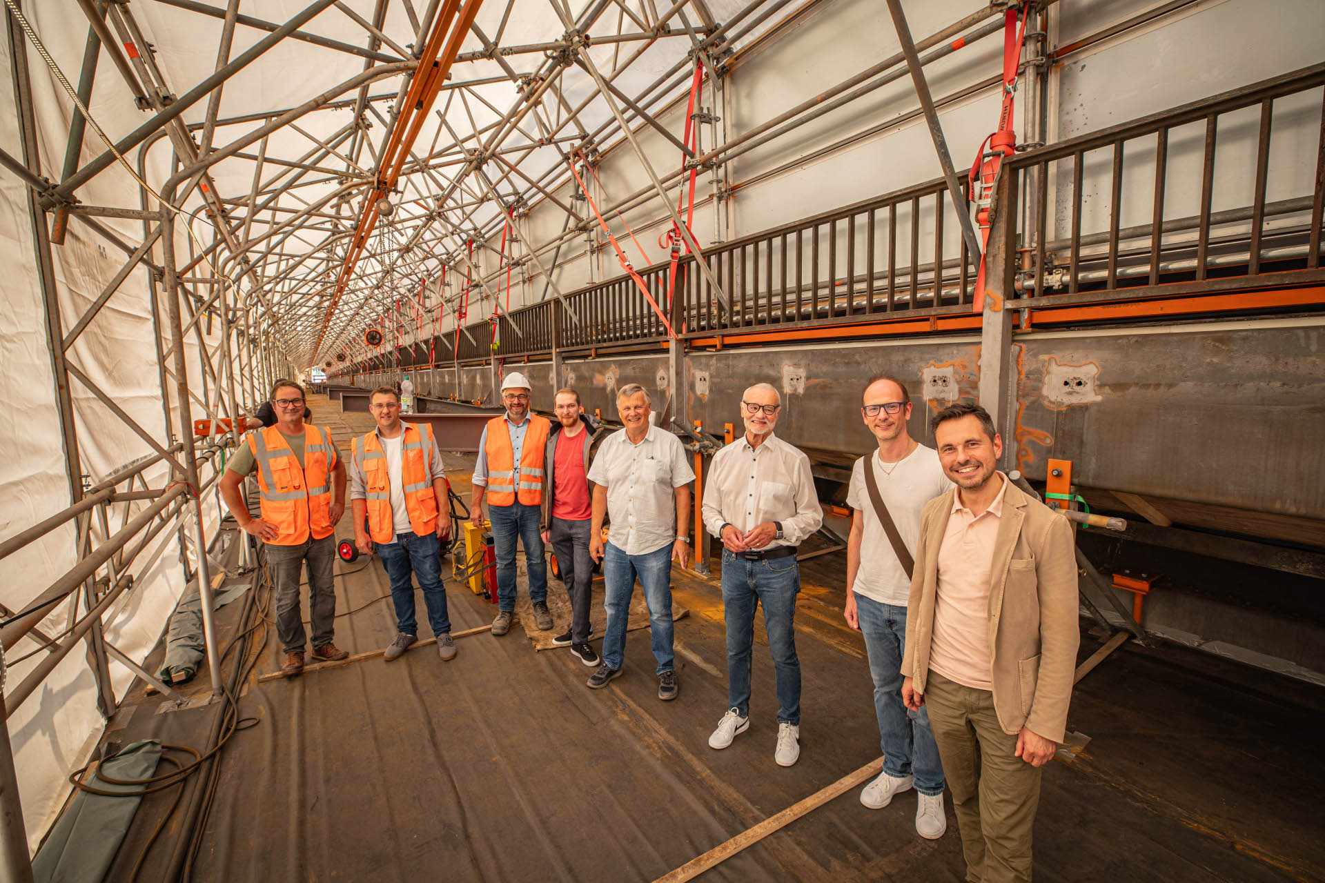 Im Anschluss an diese Arbeiten erfolgt der Korrosionsschutz der neuen und alten Bestandteile des Kragarms und das Montieren der neuen Gehwegplatten sowie der Brückengeländer. Ab voraussichtlich November wird das Gerüst in den 2. Bauabschnitt umgebaut werden.