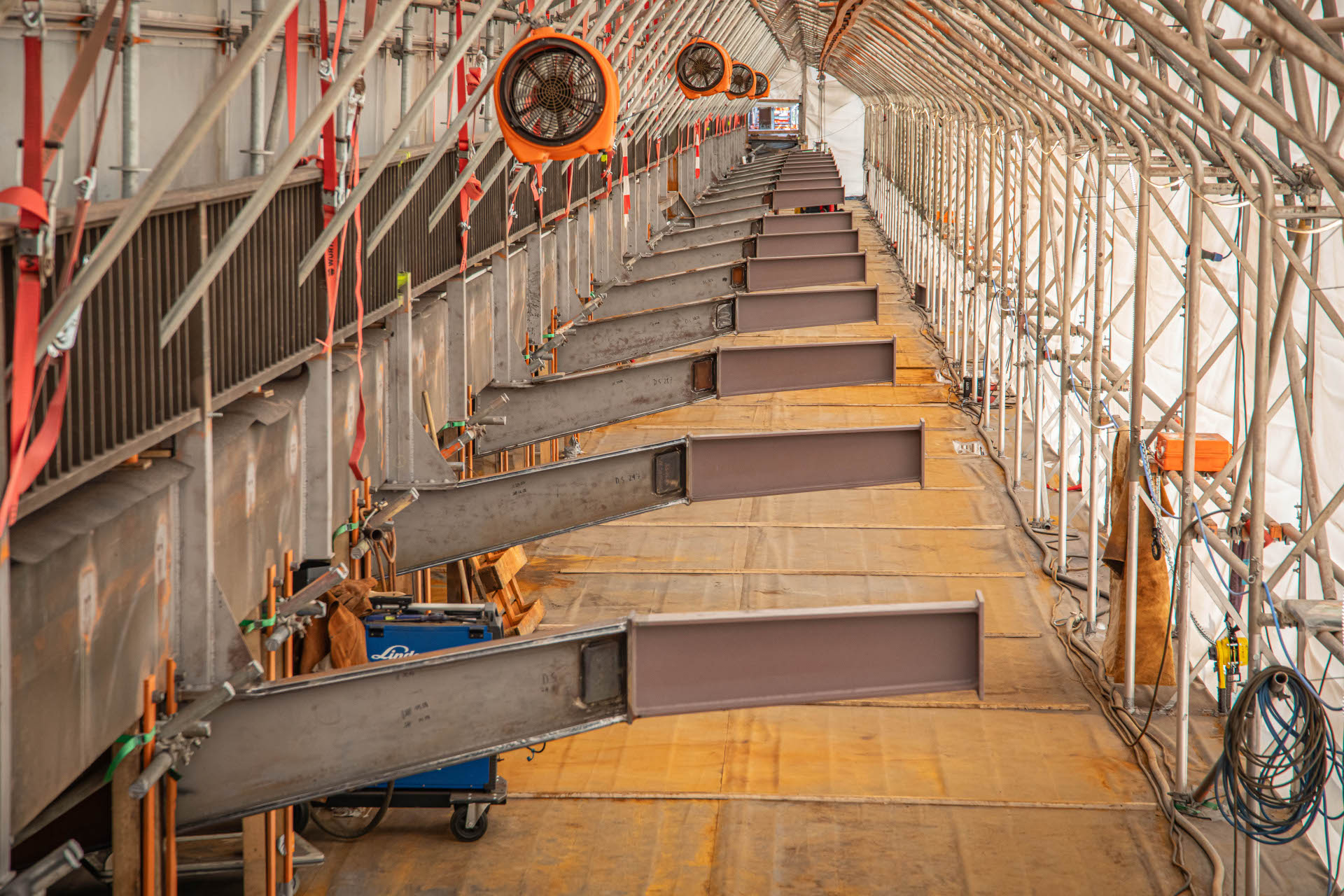 Mittlerweile konnte die alte Beschichtung abgetragen werden, sodass nun die vorhandenen Querträger auf ihre endgültige Breite verlängert werden. Hierzu werden an die bestehenden Querträger der Altkonstruktion Stahlträger angeschweißt.