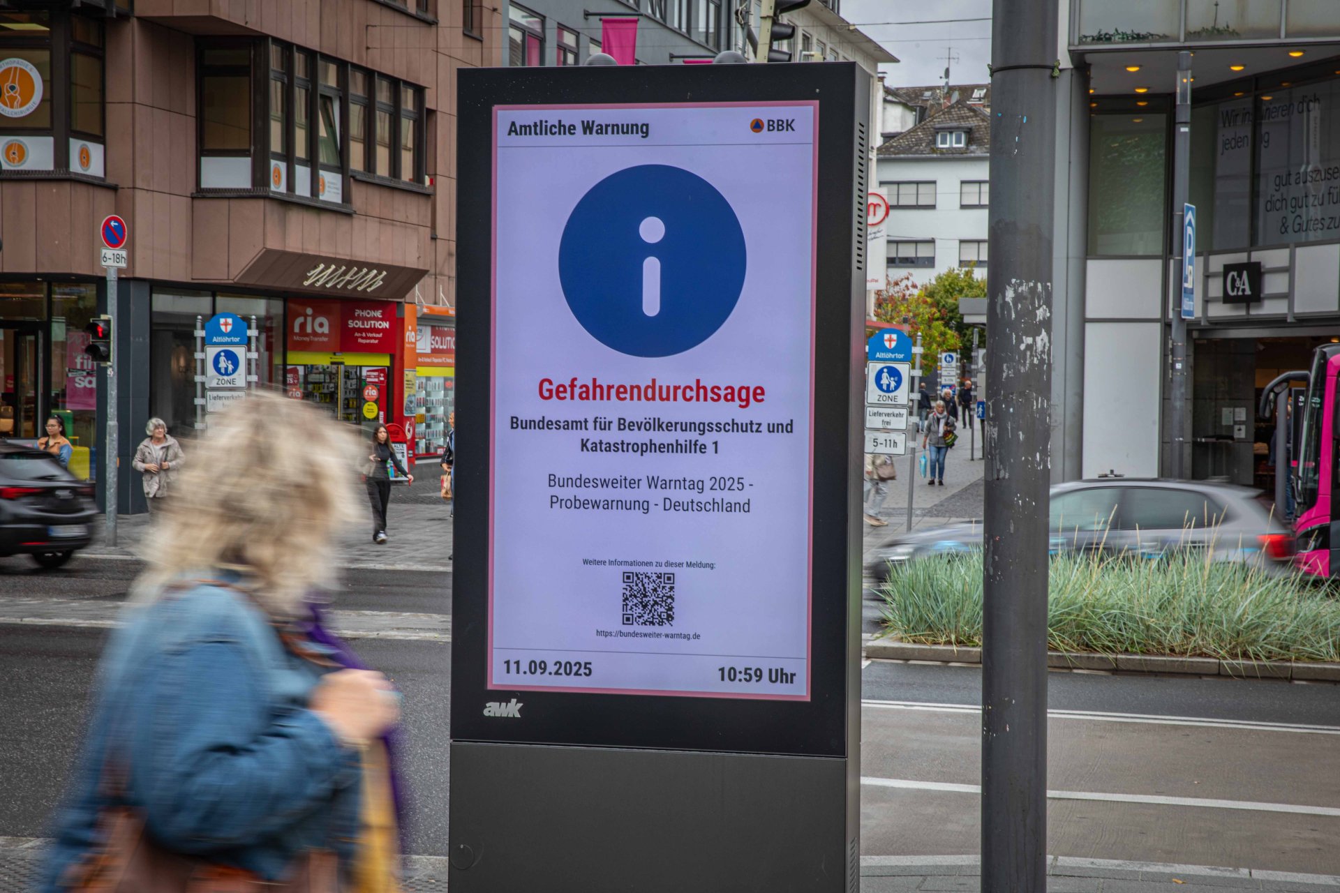 Beim bundesweiten Warntag im September 2025 wurden in Koblenz auch erstmal automatisch über das vom Bund betriebene Warnsystem MoWas Warnungen auf den von der awk betriebenen Digitalscreens im Stadtgebiet ausgespielt. Foto: Stadt Koblenz/Andreas Egenolf