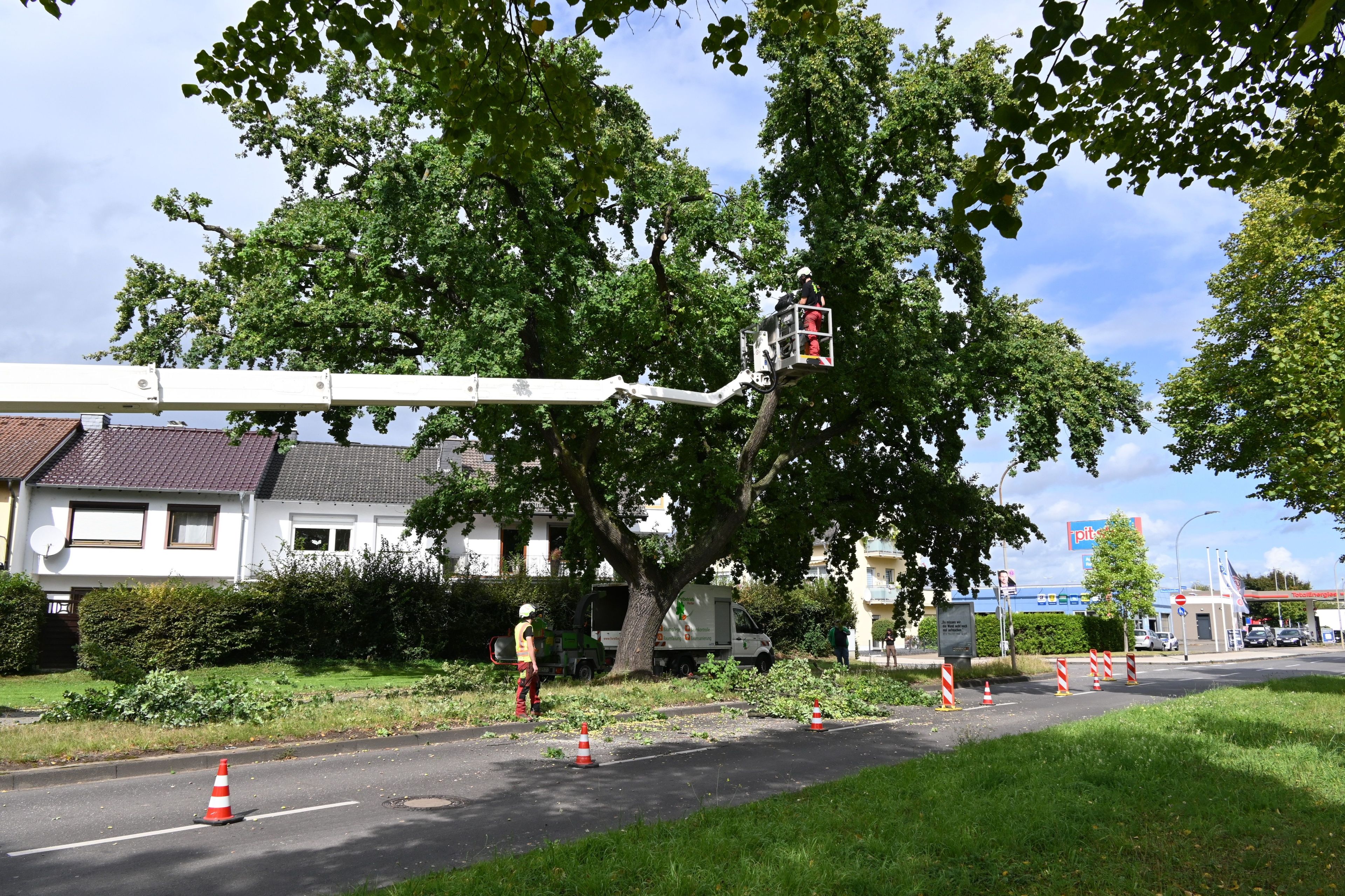 Eine markante Eiche an der Schlachthofstraße bereitet Sorgen: Der rund 70 Jahre alte Baum ist an der Vergabelung seines Stamms in etwa zwei Metern Höhe aufgerissen – vermutlich durch die Auswirkung von Wind und Starkregen in den aktuell viele Eicheln tragenden Ästen. Die Hänge-Stieleiche (botanisch: Quercus robur 'Pendula') steht direkt an der Ecke Rauentalshöhe und Schlachthofstraße, unmittelbar neben der Fahrbahn. Während der Sicherungsarbeiten kam es daher zu leichten Behinderungen im Autoverkehr.