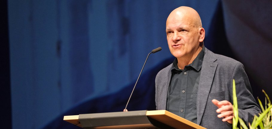 Bildunterschrift: Der diesjährige Gewinner des Joseph-Breitbach-Preises Frank Witzel während seiner Dankesrede.