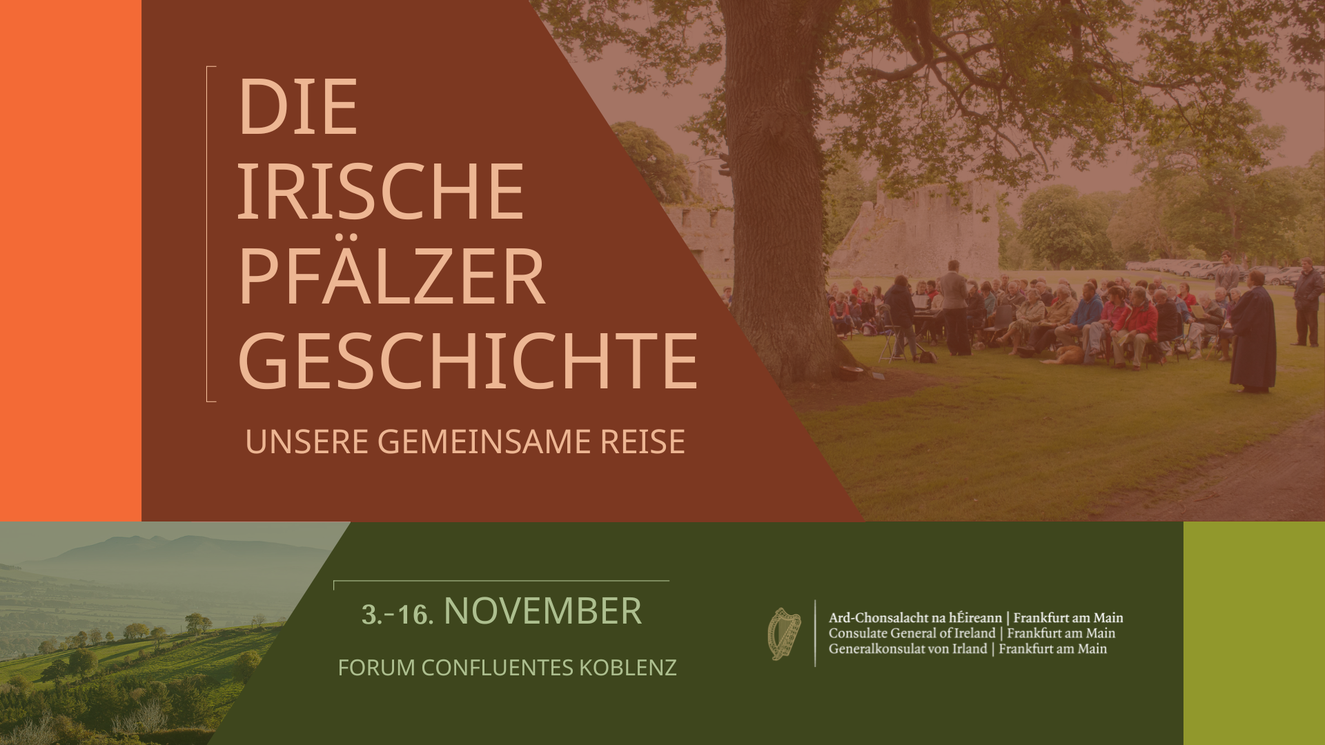 Während der letzten 12 Monate hat das Generalkonsulat von Irland in Frankfurt in enger Zusammenarbeit mit Archiven in Deutschland und Irland eine beeindruckende Wanderausstellung zusammengestellt, die in ihrer Art einzigartig ist und die Geschichte der „irischen Pfälzer“ erzählt. Die Ausstellung umfasst 20 Roll-ups und enthält Fotos, Drucke sowie Bildtexte in deutscher und englischer Sprache sowie eine zweisprachige Broschüre.
