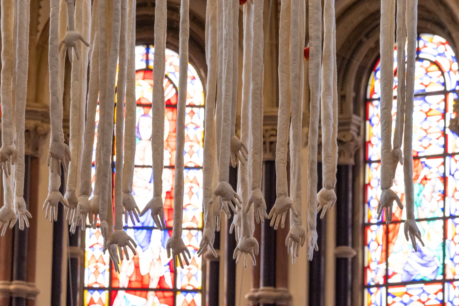 Auch die bildende Kunst setzte einen besonderen Akzent: Das Kunstwerk „Mensch“ von Barbara Gröbl, vom Kirchengewölbe herabhängende Arme und Hände aus Leinen mit Äpfeln, thematisierte den Sündenfall und die Widersprüchlichkeit menschlicher Existenz mit der Fähigkeit zu lieben und zu zerstören, zu schöpfen und zu vernichten und spannte damit einen visuellen Bogen zum Leitmotiv der Veranstaltung. Das Kunstwerk wird noch bis Sonntag, 15. März 2026 in der Herz-Jesu-Kirche hängen und kann dort zu den Öffnungszeiten besichtigt werden.