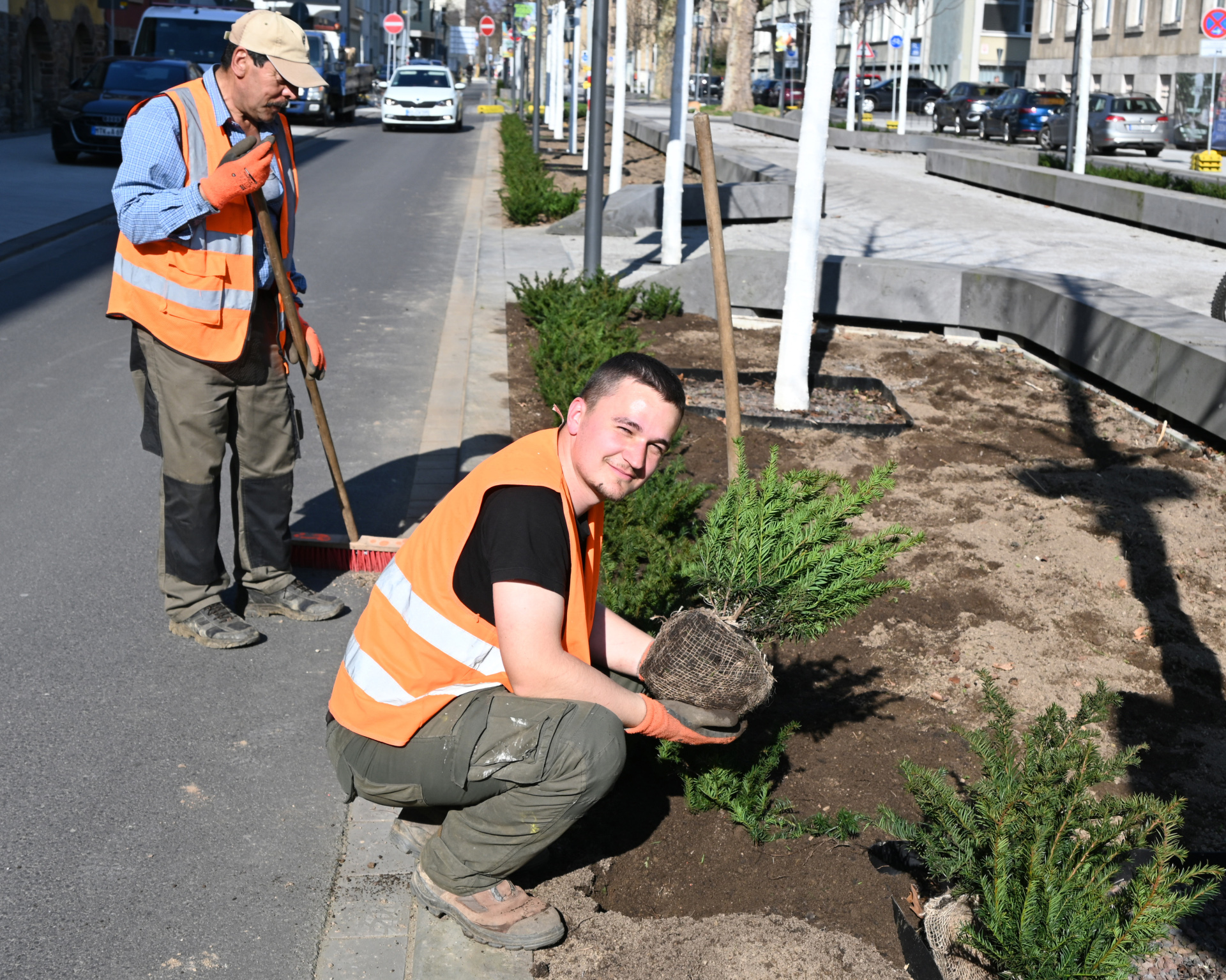 Foto (Stadt Koblenz/Verena Groß): Die Unterpflanzung der Vogelkirschen in der Südallee mit immergrünen Eiben hat begonnen.