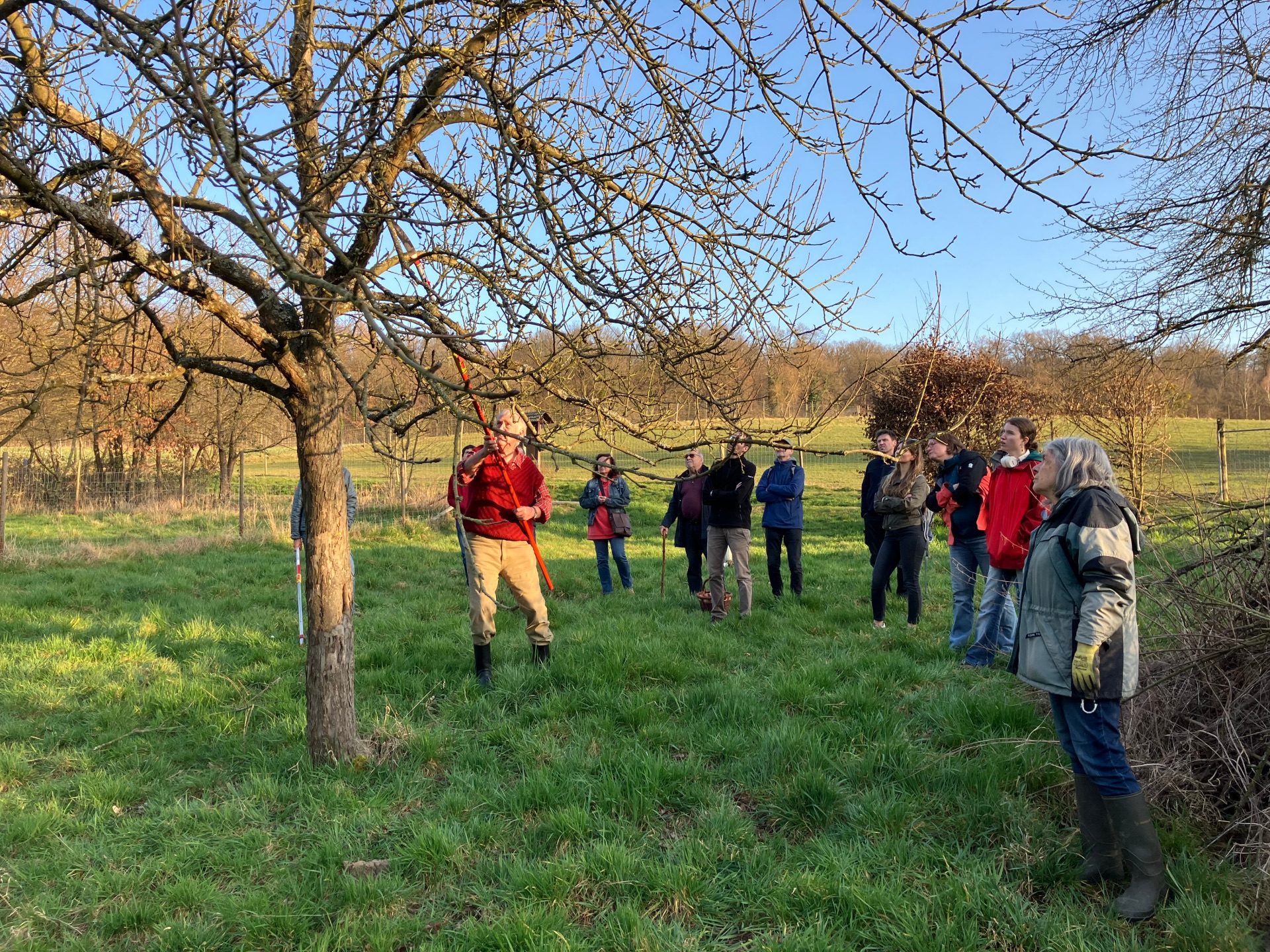 Zu Beginn vermittelte Manfred Braun in der Waldökostation die wichtigsten theoretischen Grundlagen der Obstbaumpflege. Anschließend ging es hinaus auf die kleine Streuobstwiese der Station. Dort demonstrierten die Referenten an jüngeren Obstbäumen verschiedene Schnitttechniken direkt in der Praxis. Einige Teilnehmende konnten dabei selbst zur Baumschere greifen und unter Anleitung erste Pflegemaßnahmen an den Bäumen durchführen.