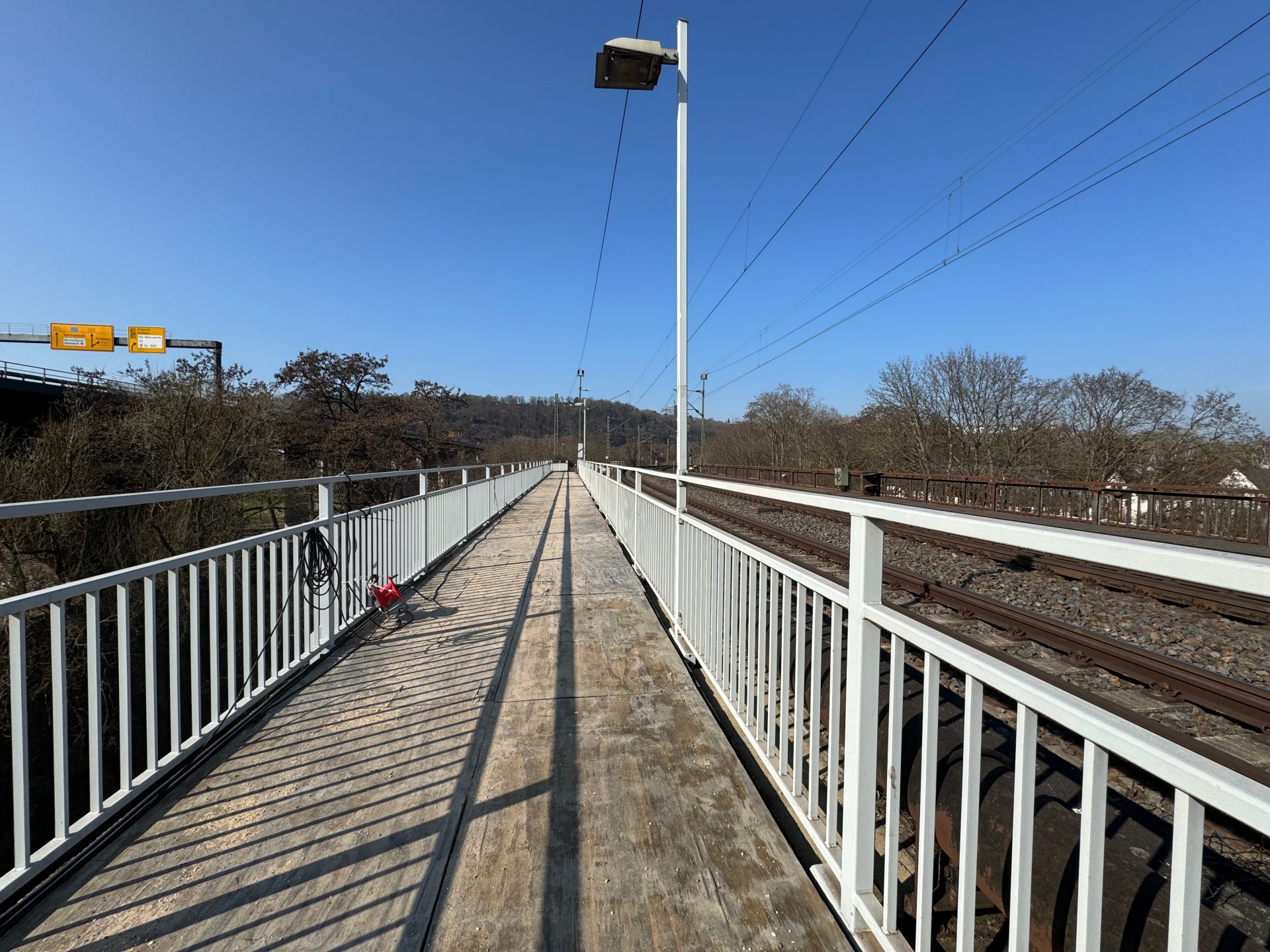 Im Vorlandbereich auf der Horchheimer Seite befinden sich unterhalb der Eisenbahnbrücke weitere Gleise. Die Flussbrücke geht hier in ein eigenständiges Bauwerk über, das dringend erneuert werden muss. Deshalb wird die neue Geh- und Radwegbrücke ab dem Flusspfeiler auf der Horchheimer Seite von der eigentlichen Eisenbahnbrücke getrennt werden, damit bei einem Neubau der Vorlandbrücke durch die Deutschen Bahn der eigentliche Rad- und Fußweg als wichtige Verbindungsachse bestehen bleiben kann. Hierfür wird im Juli 2026 die eigenständige Brückenkonstruktion während einer Bahnsperrpause eingehoben.