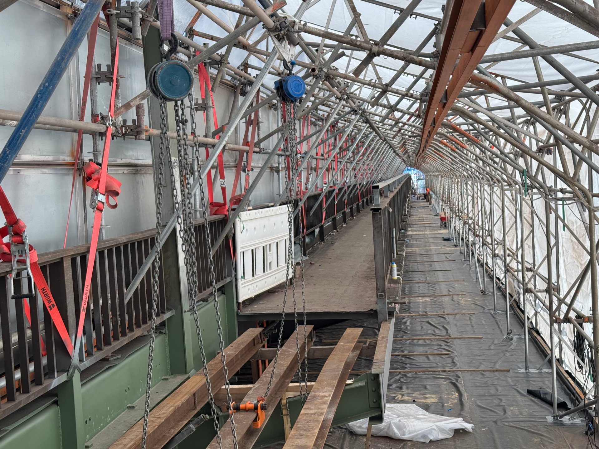 Eine weitere Besonderheit des Projektes ist, dass die Bauarbeiten parallel zum dortigen Bahnverkehr stattfinden: Kurzzeitige Unterbrechungen der Arbeit finden regelmäßig statt, da die Brücke Erschütterungen durch darüberfahrende Züge ausgesetzt ist. Doch die aktuellen Arbeiten im Baufeld haben noch eine weitere Herausforderung: Die Farbbeschichtung der alten Konstruktionen wird derzeit abgetragen, weshalb besondere Schutzanzüge und Atemschutzmasken für das Baustellenpersonal erforderlich sind.