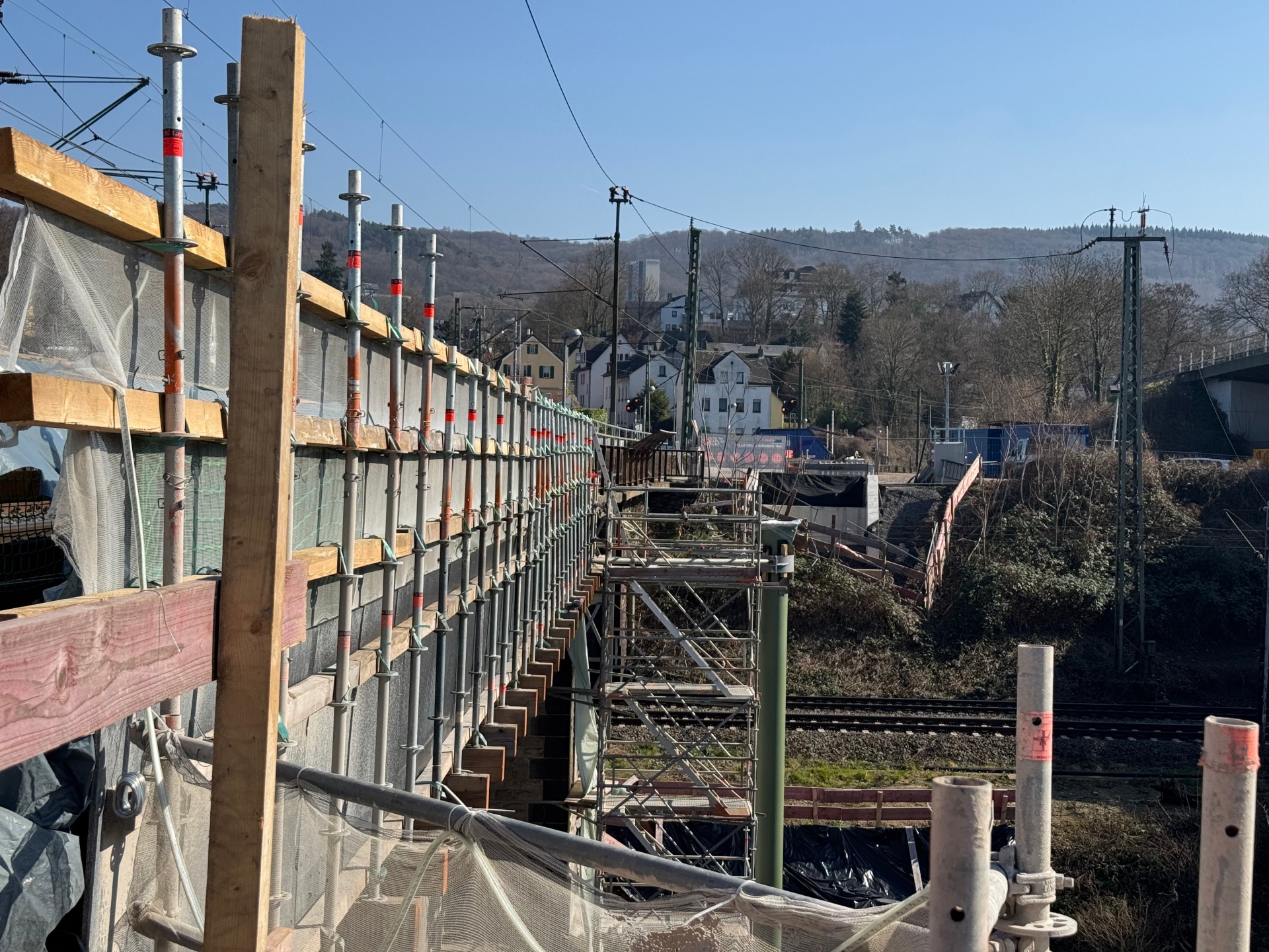 Bereits seit Anfang März konnten die Umbauarbeiten des Arbeits- und Schutzgerüstes vom 1. Bauabschnitt in den 2. Bauabschnitt beim Brückenbauwerk Horchheimer Eisenbahnbrücke zum Ausbau des Geh- und Radweges im Auftrag des städtischen Tiefbauamtes abgeschlossen werden.