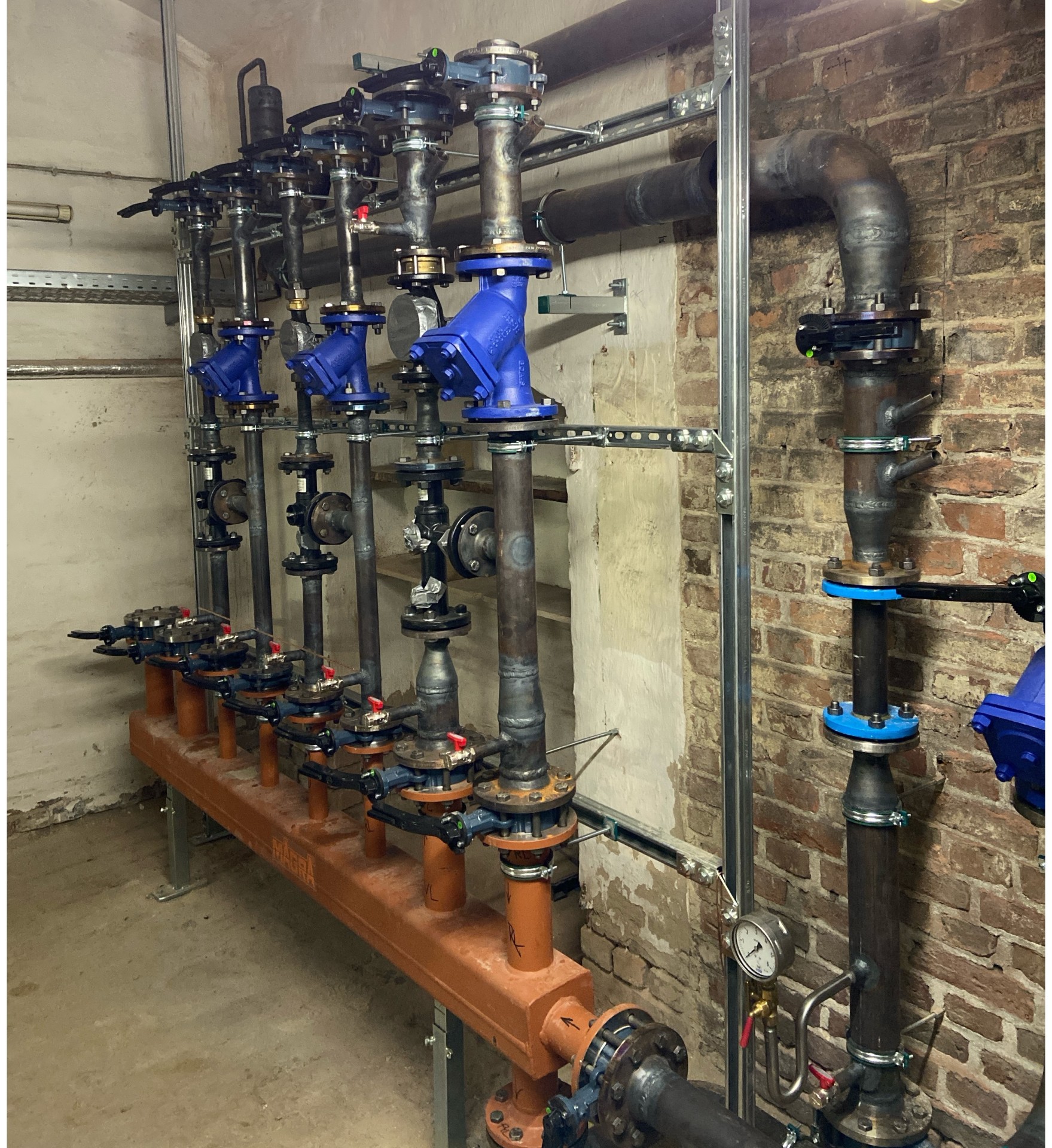 Bild 2: Heizungsverteiler im Keller des Görres-Gymnasiums – Teil der neuen klimafreundlichen Wärmeversorgung mit Wärmepumpentechnik. Foto: Stadt Koblenz/ Christof Jürgens