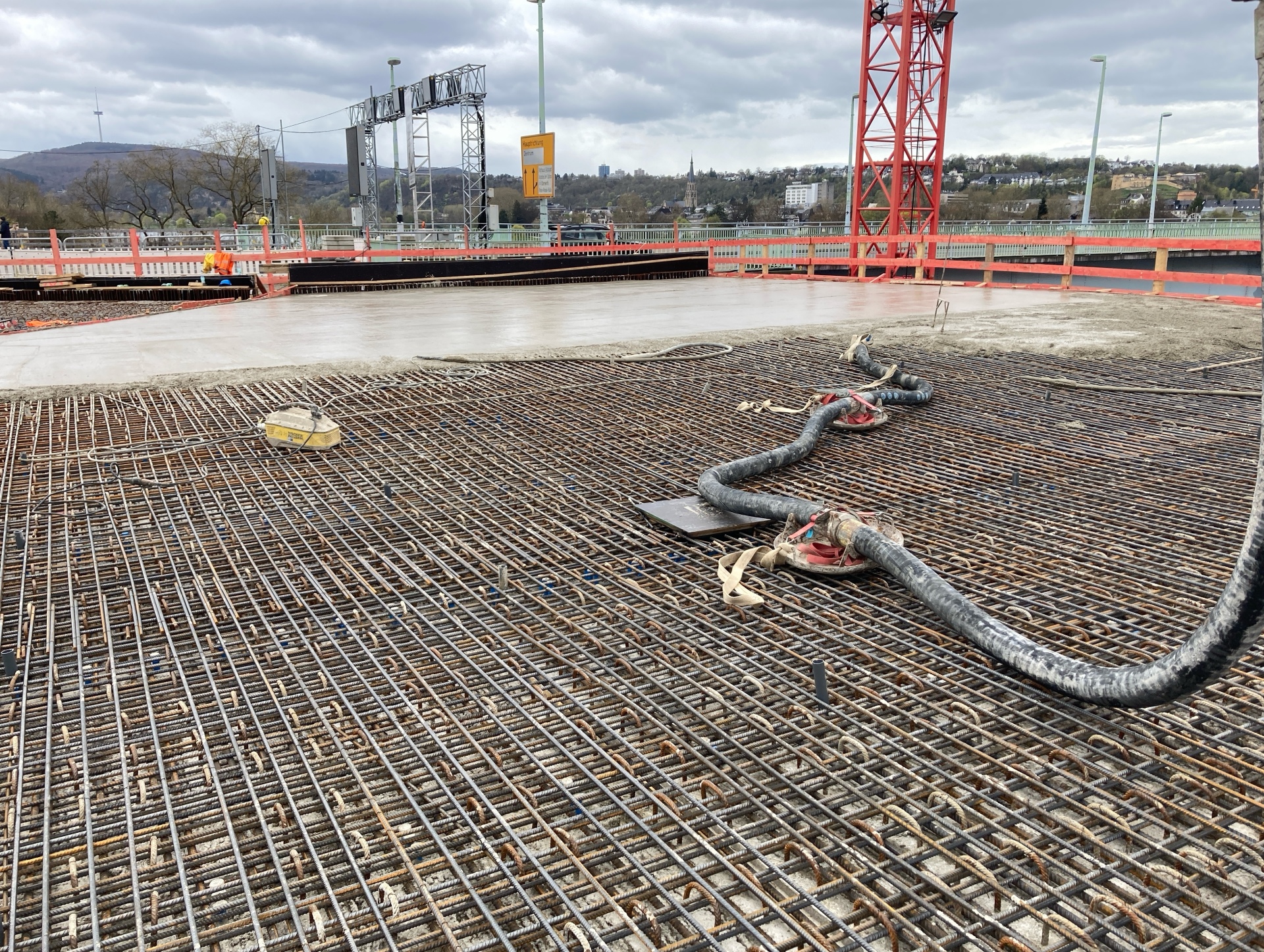 Bild 1: Mithilfe einer Betonverteilerpumpe wurde der Beton auf das höhergelegene Bauwerk transportiert. Foto: Stadt Koblenz/ Anika Dünnes