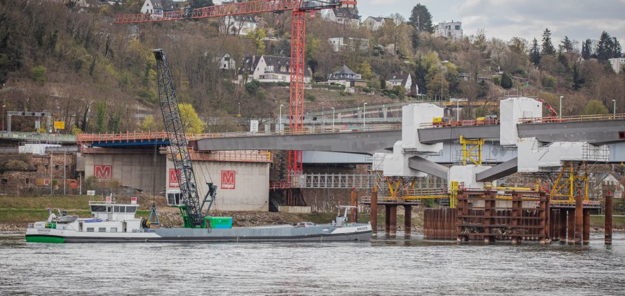Bei Baggerarbeiten auf dem Rhein wurde am Gründonnerstag an der Baustelle für den Neubau der Pfaffendorfer Brücke in Koblenz ein Blindgänger aus dem Zweiten Weltkrieg entdeckt. Foto: Stadt Koblenz/Andreas Egenolf