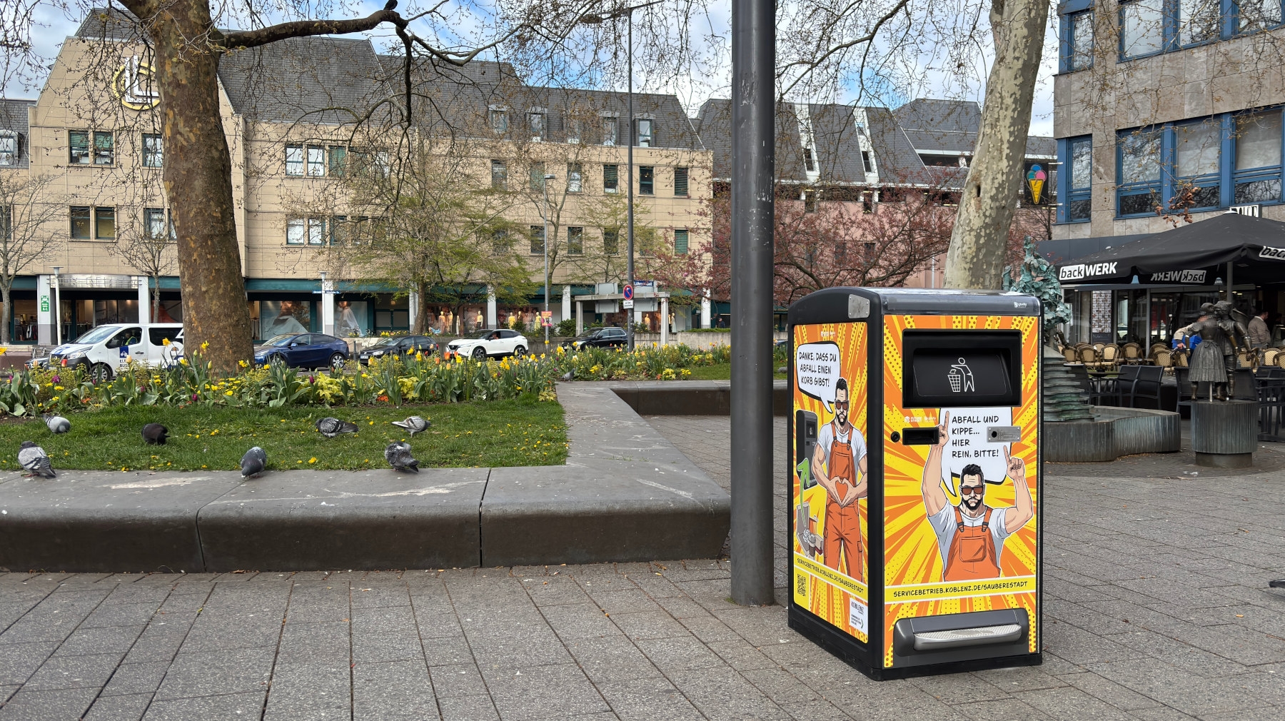 An ausgewählten Standorten in der Koblenzer Innenstadt testet der Kommunale Servicebetrieb Koblenz derzeit moderne Papierkörbe. Im Gegensatz zu herkömmlichen öffentlichen Abfallbehältern fasst der annähernd brusthohe, schrankartige Papierkorb bereits aufgrund seiner Größe mehr Abfall.