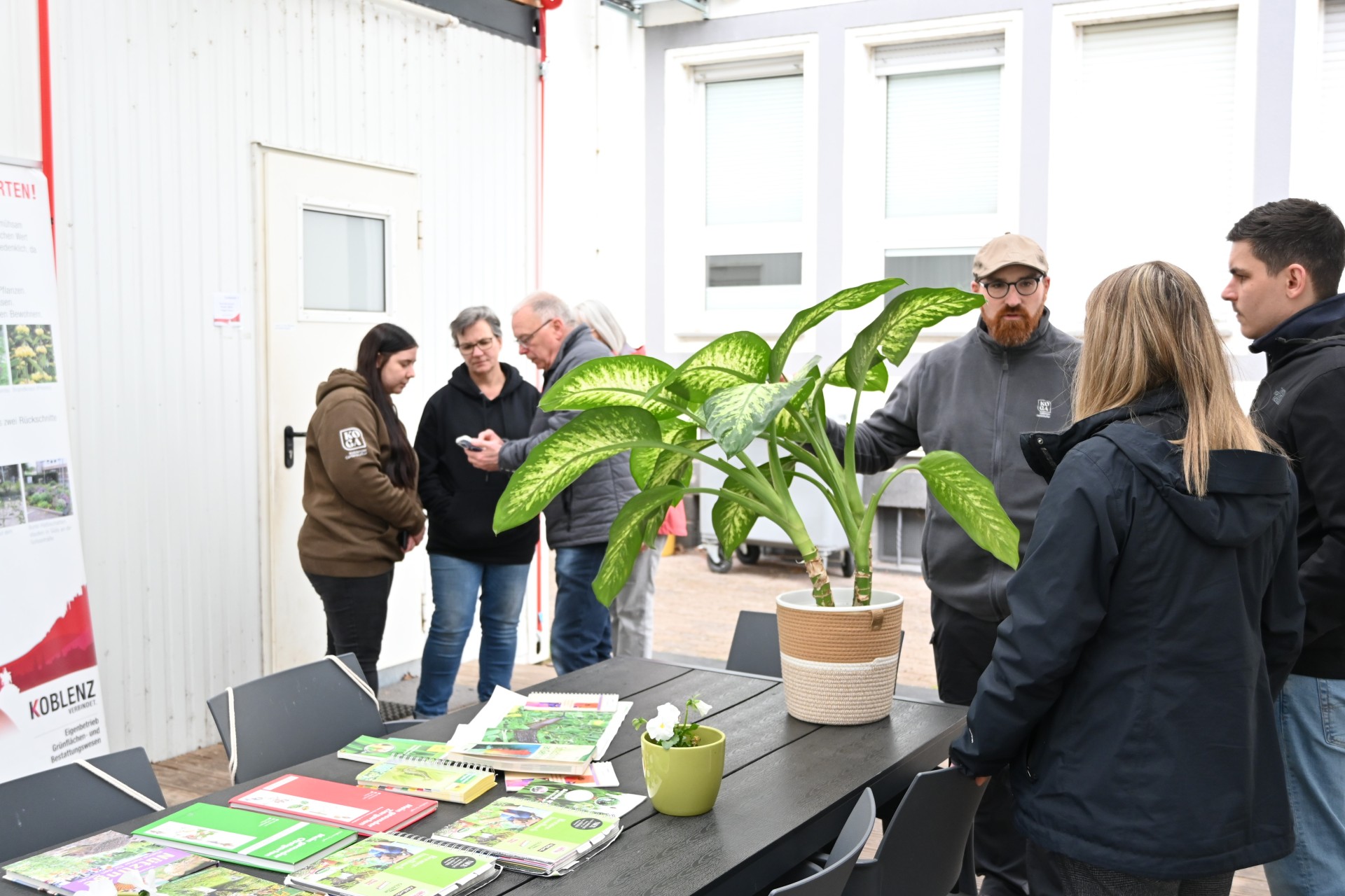 An Tischen zwischen den Bürocontainern stehen die durch die Gartenakademie Rheinland-Pfalz zertifizierten Expertinnen und Experten für Fragen zu saisonalen Themen aus dem Klein- und Hausgarten bereit. Ratsuchende können beispielsweise befallene Blätter oder Triebe mitbringen, um mögliche Pflanzenkrankheiten oder Schädlingsbefall bestimmen zu lassen.