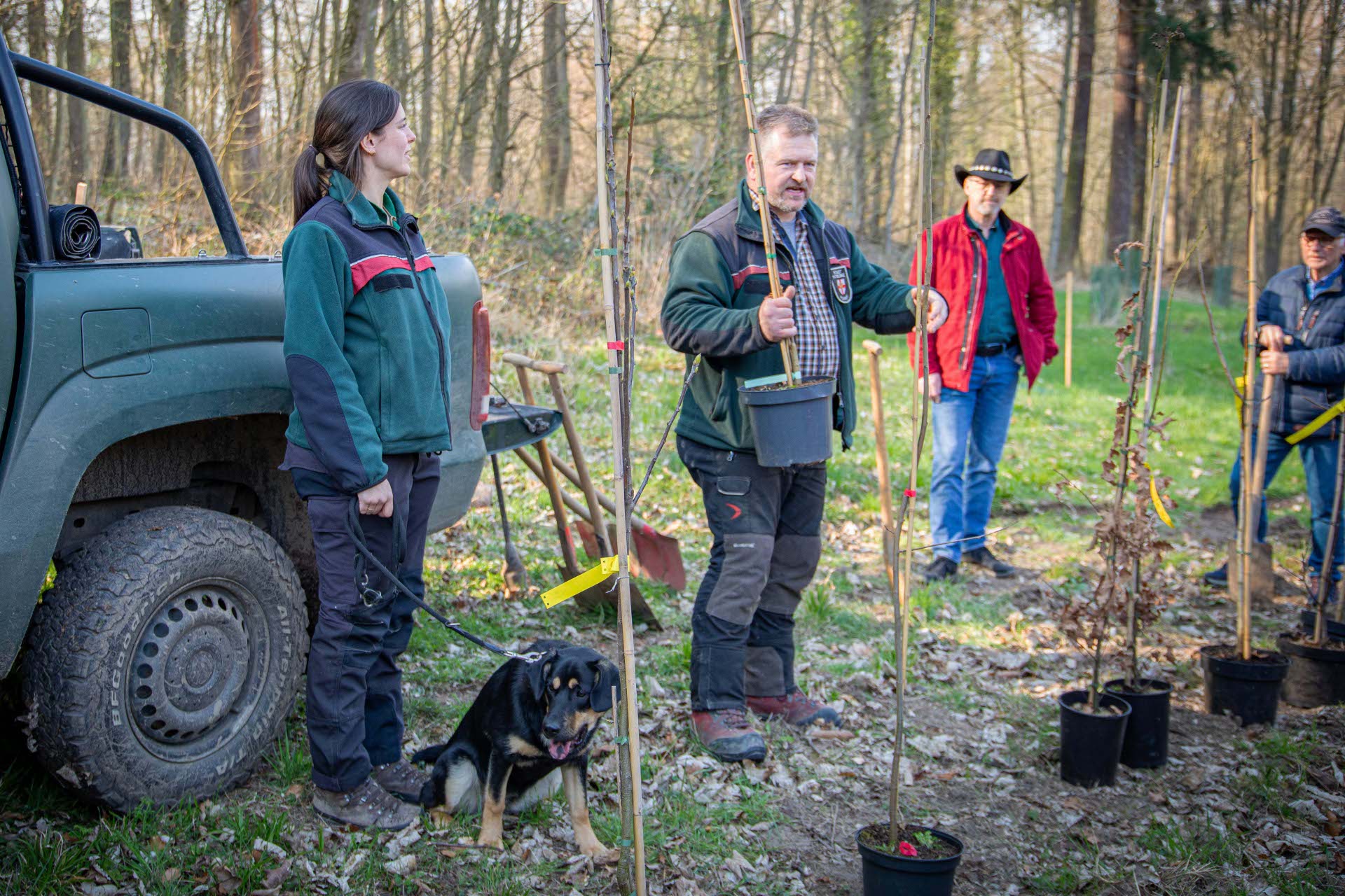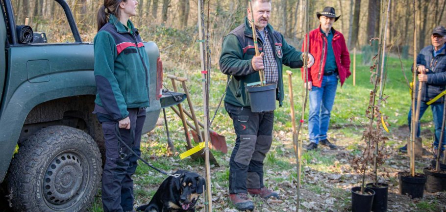 Die Teilnehmer konnten sich vorab zwischen verschiedene Baumarten entscheiden „Wir setzten dabei besonders auf Baumarten, die sich für die veränderten Klimabedingungen eignen. Die Auswahl kann je nach Verfügbarkeit leicht variieren, aber wir versuchen auch individuelle Wünsche gerne zu berücksichtigen“, sagt Miriam Rosenbach. Dieses Mal wurden Wildapfel, Speierling, Elsbeere, Traubeneiche, Winterlinde, Spitzahorn und Walnuss gepflanzt.