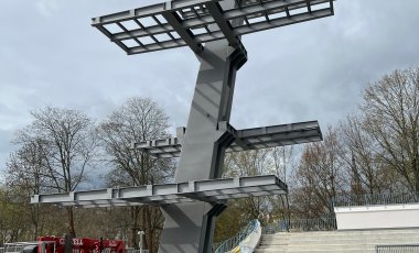 Im Freibad Oberwerth wurde am Freitag, den 24. März, die 6 Tonnen schwere Stahlkonstruktion des neuen Sprungturms montiert. Aktuell laufen noch die Arbeiten an Treppen und Geländern, so dass der Turm – Stand jetzt – zum Beginn der Freibadsaison im Mai fertig sein wird.