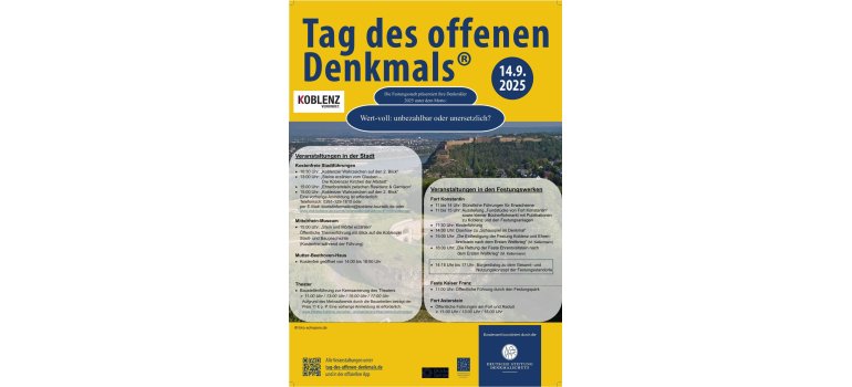Der Tag des offenen Denkmals am Sonntag, 14. September, steht unter dem Motto: „Wertvoll: unbezahlbar oder unersetzlich“. In Koblenz bietet die Denkmalpflege im Amt für Stadtentwicklung und Bauordnung der Stadt Koblenz in Kooperation mit dem Zentralen Gebäudemanagement der Stadt Koblenz, der Koblenz-Touristik, dem Eigenbetrieb Grünflächen- und Bestattungswesen, der Deutschen Stiftung Denkmalschutz, den Fördervereinen (Fort Asterstein, Feste Kaiser Franz und Fort Konstantin) sowie dem Mittelrhein-Museum, dem Mutter-Beethoven-Haus und dem Theater Koblenz ein vielfältiges Programm an.